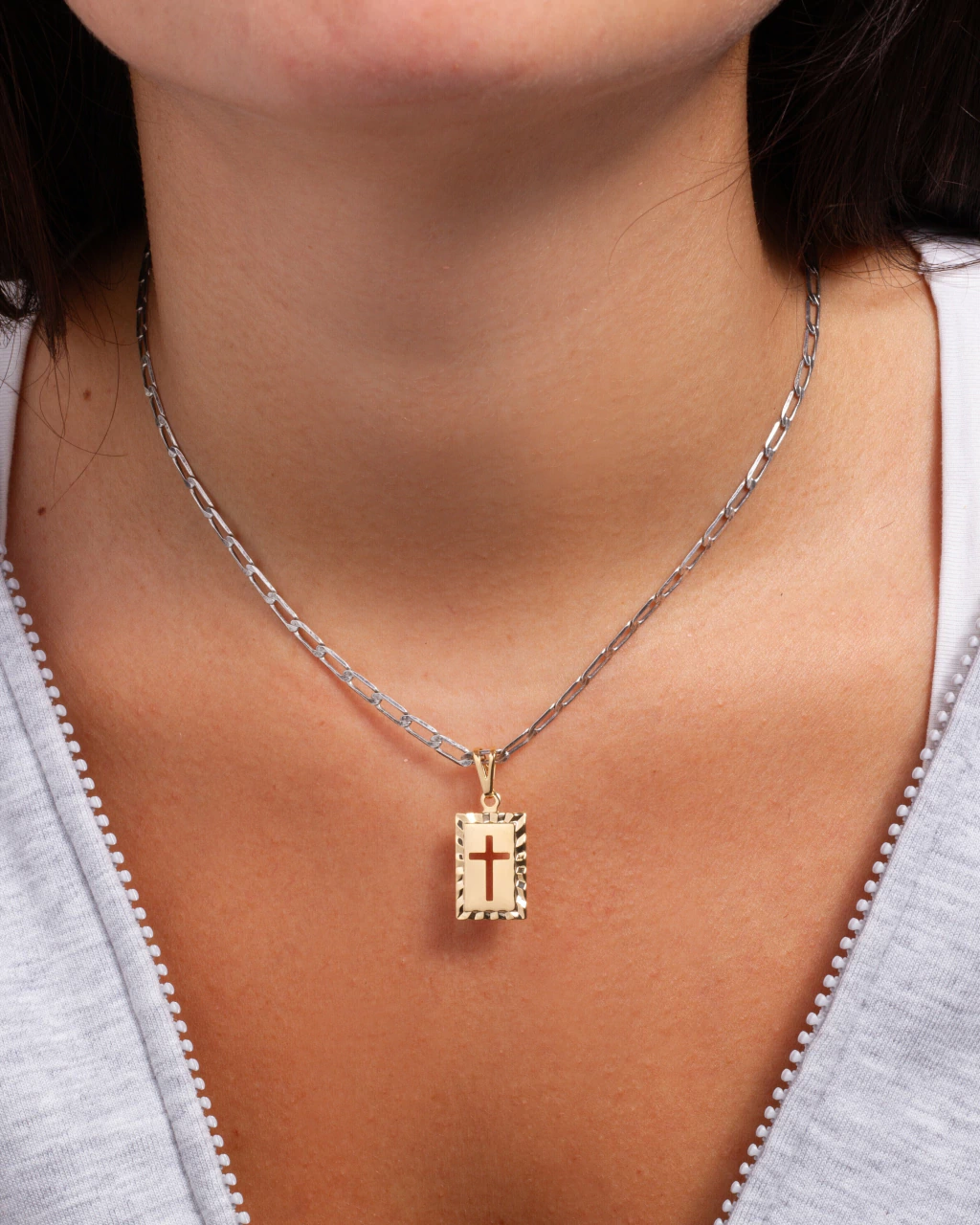Cadena enchapada en Plata VADEKA y dije rectangular de cruz enchapado en Oro 18k. Calidad VADEKA. Usalo como choker o como collar.