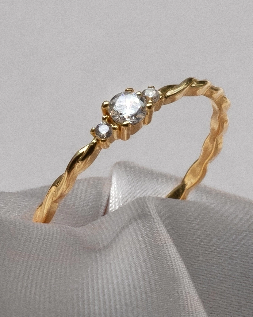 Anillo enchapado en Oro 18k,calidad VADEKA, torzado finito con piedra zircornia engarzada en el centro.
