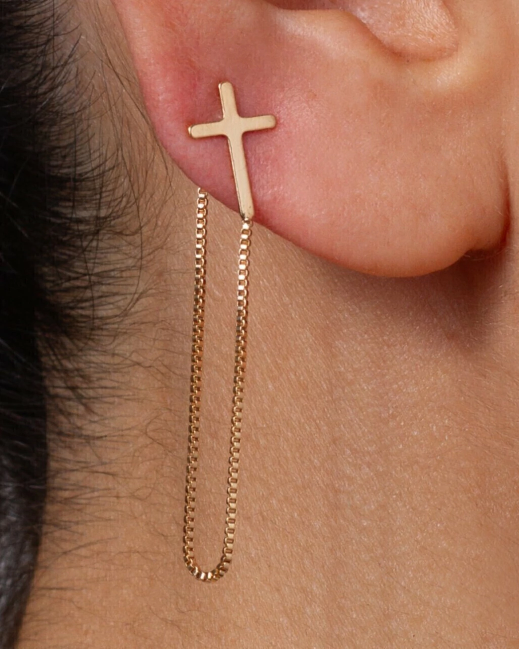 Stud completamente enchapado en Oro 18k, Calidad VADEKA, con forma de cruz y cadena colgante y ganchito mariposa en su extremo.