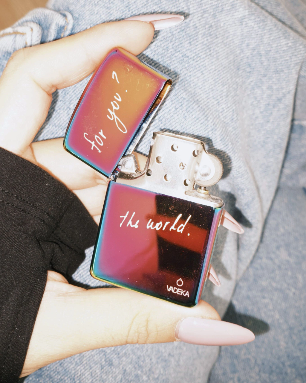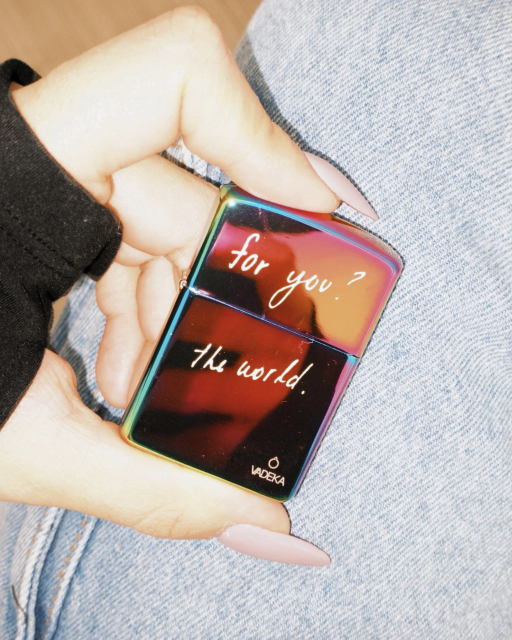 Encendedor tornasolado con grabado "for you? the world" y logo VADEKA.