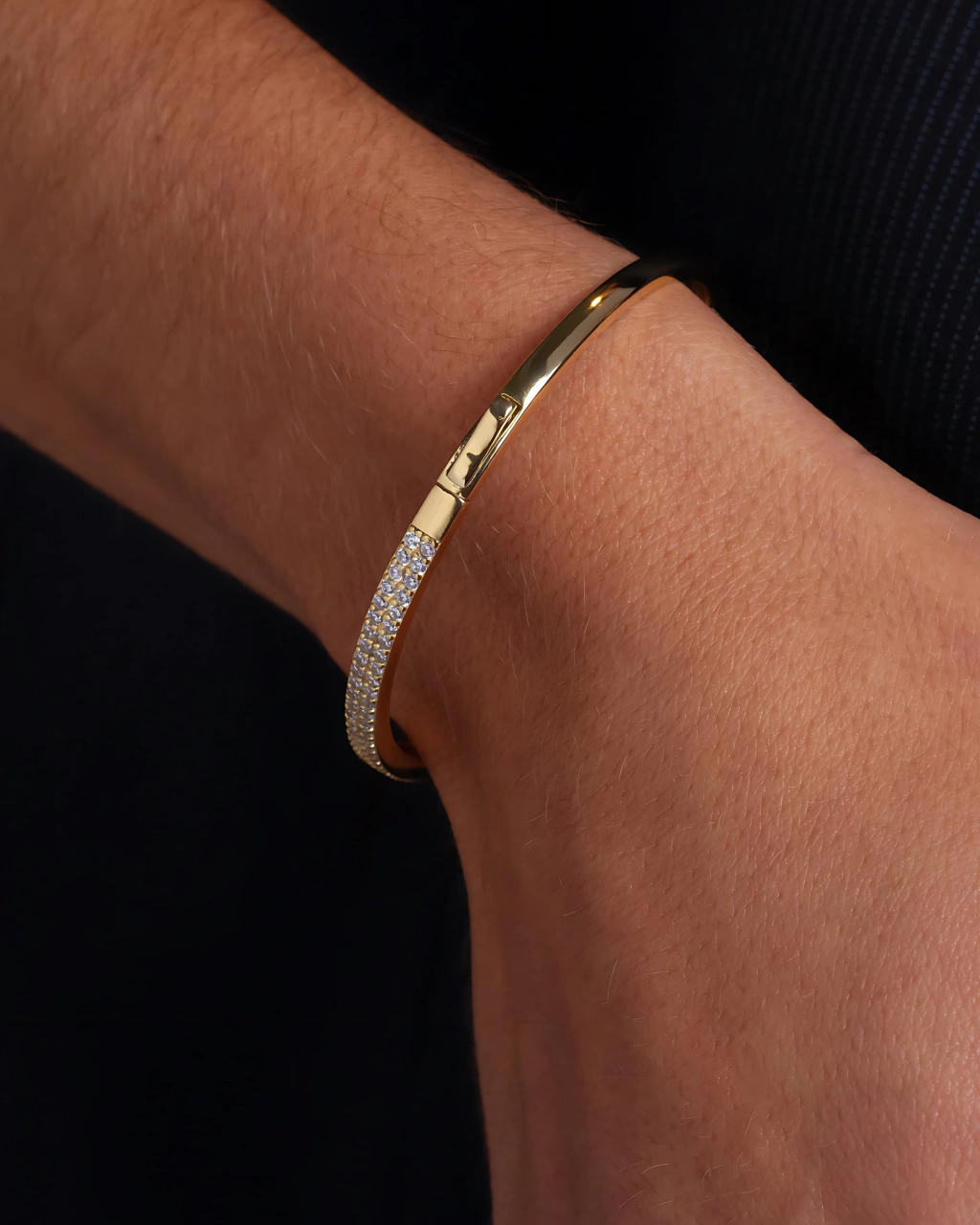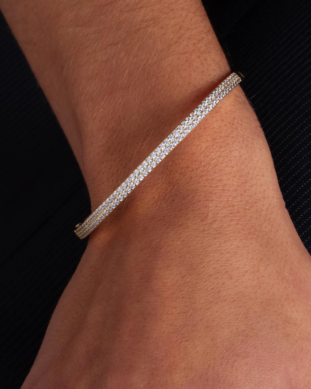 Pulsera enchapada en Oro 18k. Calidad VADEKA, con roquitas zirconia color cristal engarzadas completamente en toda su mitad, y la otra mitad lisa.